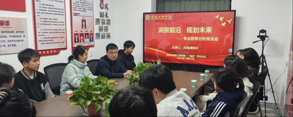 为深化“一站式”学生社区育人内涵,助力学生精准把握专业动态、科学规划学业发展,2025年10月22日晚,化学与材料工程学院于学生社区党团活动室成功举行“洞察前沿,规划未来”专业前景分析座谈会。学院院长冯海涛教授、辅导员柴垚与13名各年级、各专业学生代表参与本次座谈。