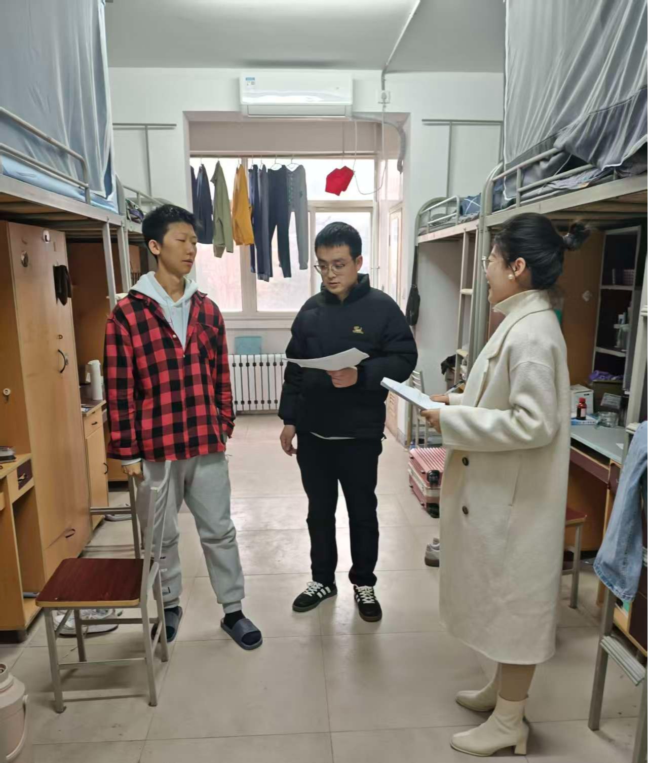 检查组首先深入留校学生宿舍开展实地检查,重点核查学生合宿情况,并全面排查违规用电、私拉电线等安全隐患,要求留校学生严格遵守宿舍安全管理规定,切实增强安全防范意识。随后,检查组前往实验室看望留校学生,叮嘱留校学生严格落实实验安全防护措施,进一步筑牢实验安全防线。学院将持续做好寒假期间留校学生管理服务与值班值守工作,全力确保校园安全稳定和谐。(化学与材料工程学院 文/柴垚 图/柴垚 审核/张力)